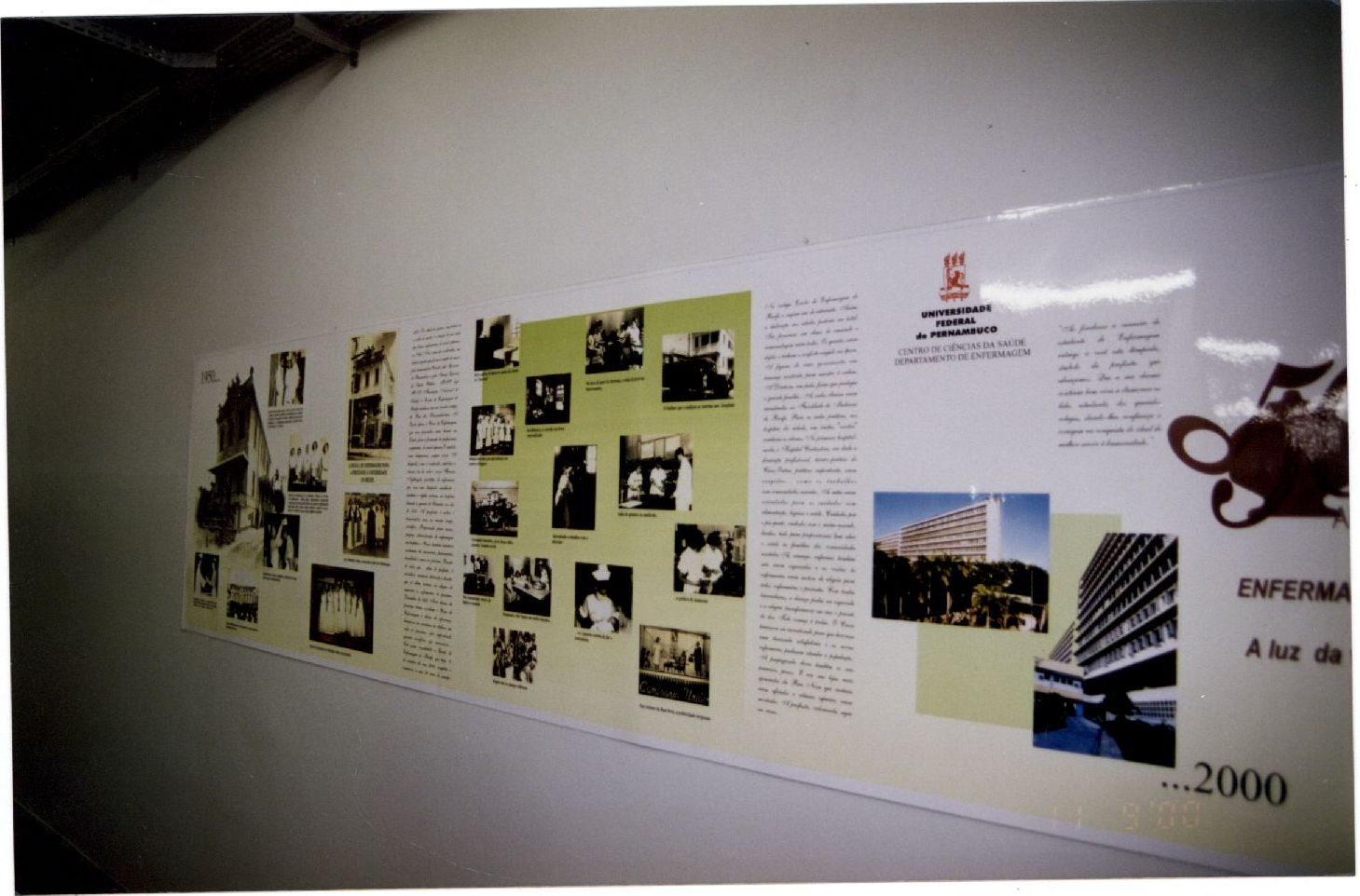Descrição: | Fotografia em cores onde é possível visualizar uma faixa com fotografias antigas e textos sobre o Departamento de Enfermagem da UFPE. |