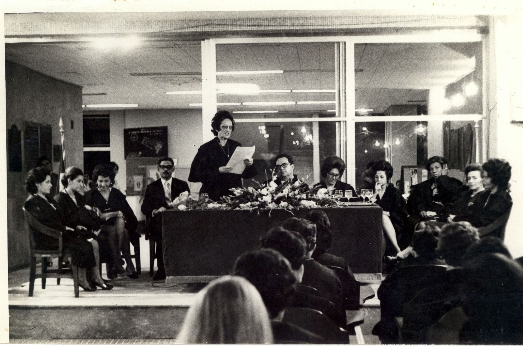 | Descrição: | Fotografia em preto e branco onde é possível visualizar o Reitor Marcionilo Lins e alunas concluintes do Curso de Enfermagem na cerimônia de Colação de Grau, em Dezembro de 1971, em frente à Faculdade de Enfermagem. Na imagem também aparece parte do público do evento. |