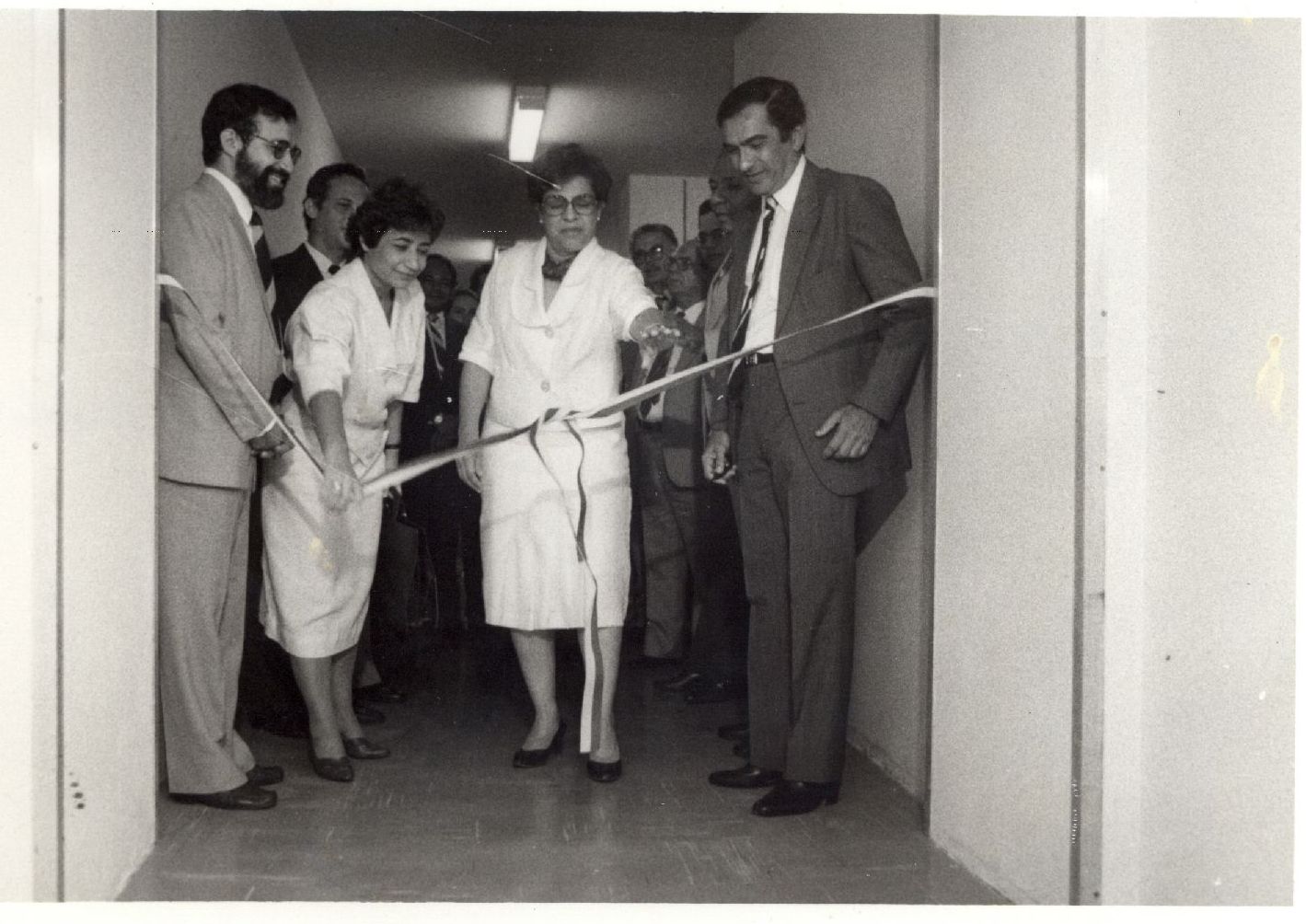 Descrição: Fotografia em preto e branco onde é possível visualizar Edite, coordenadora do Curso Médico, em momento de corte de faixa inaugural na presença de outras personalidades, em 11 de agosto de 1986. No verso da foto consta a seguinte informação escrita à caneta: “Dra. Edite; Coord. Curso Médico; 11 ago 86”.