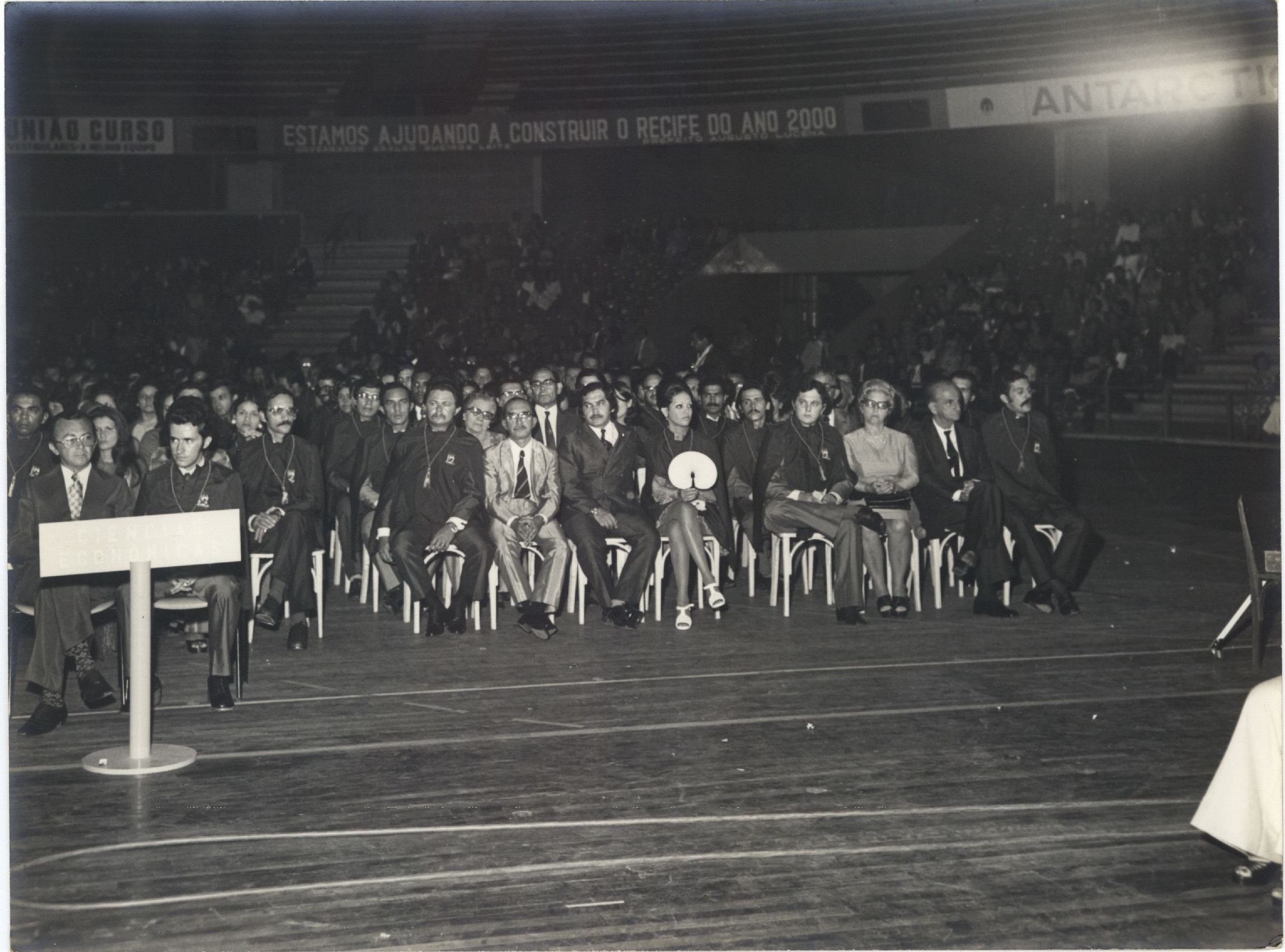 Descrição: | Fotografia em preto e branco onde é possível visualizar o público de um evento da Faculdade de Odontologia em uma quadra. No verso da foto consta a seguinte informação escrita a lápis: “Fac. Odonto”. |