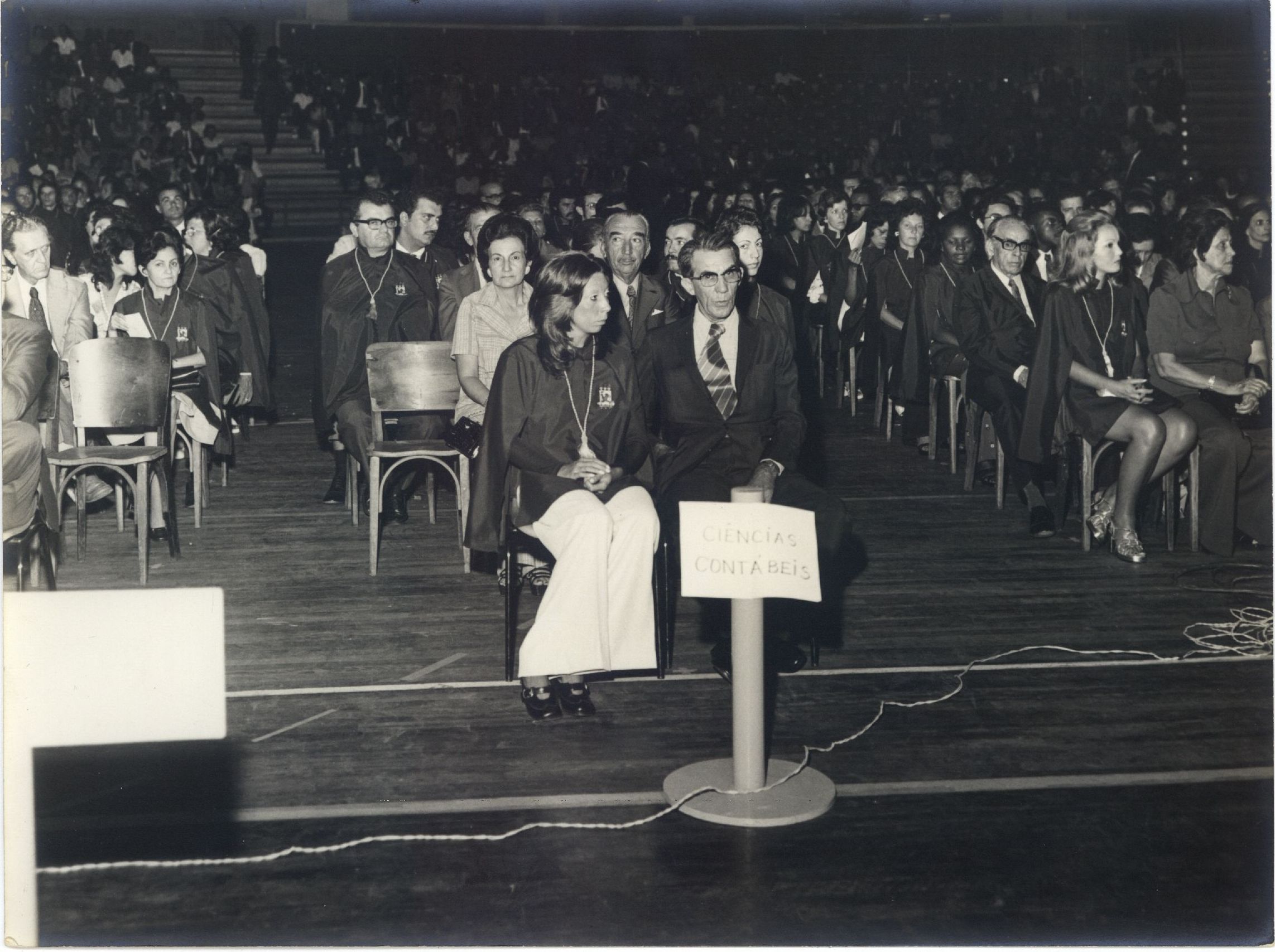 Descrição: | Fotografia em preto e branco onde é possível visualizar o público de um evento em uma quadra. Na imagem aparecem pessoas de beca de formatura e uma placa com a seguinte informação: “Ciência Contábeis”. No verso da foto consta a seguinte informação escrita a lápis: “Fac. Odonto”. |