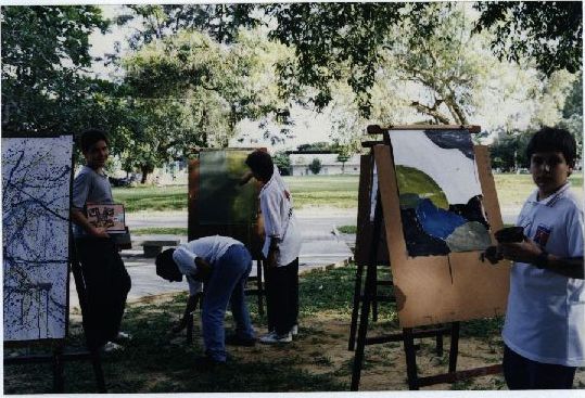 Description: Fotografia em cores onde é possível visualizar alunos do Colégio de Aplicação pintando em momento de aula na área verde da UFPE. Não constam informações no verso da foto.