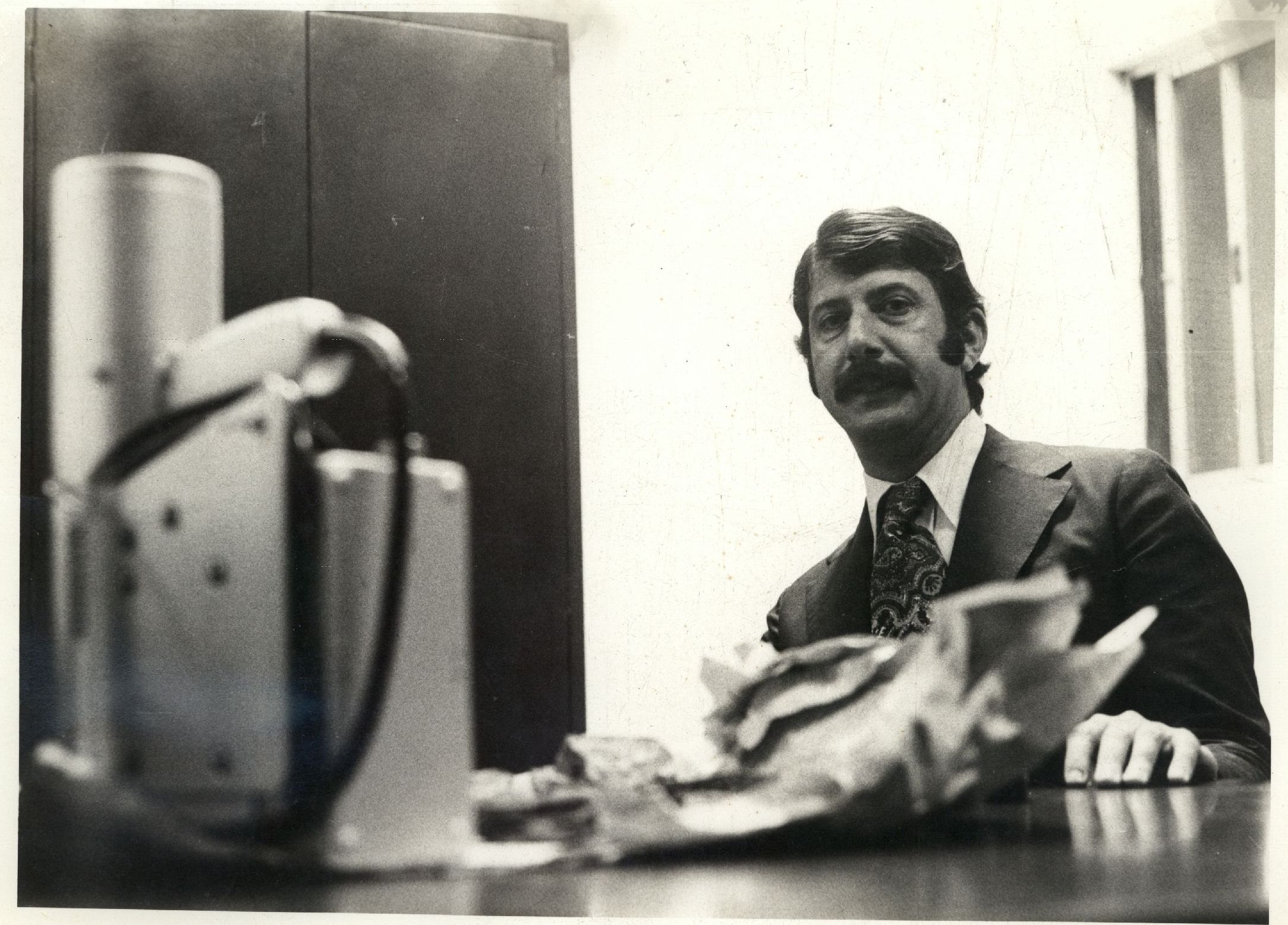Description: Fotografia em preto e branco onde é possível visualizar homem não identificado em momento de fala. No verso da foto consta a seguinte informação escrita à caneta: "geociencias".