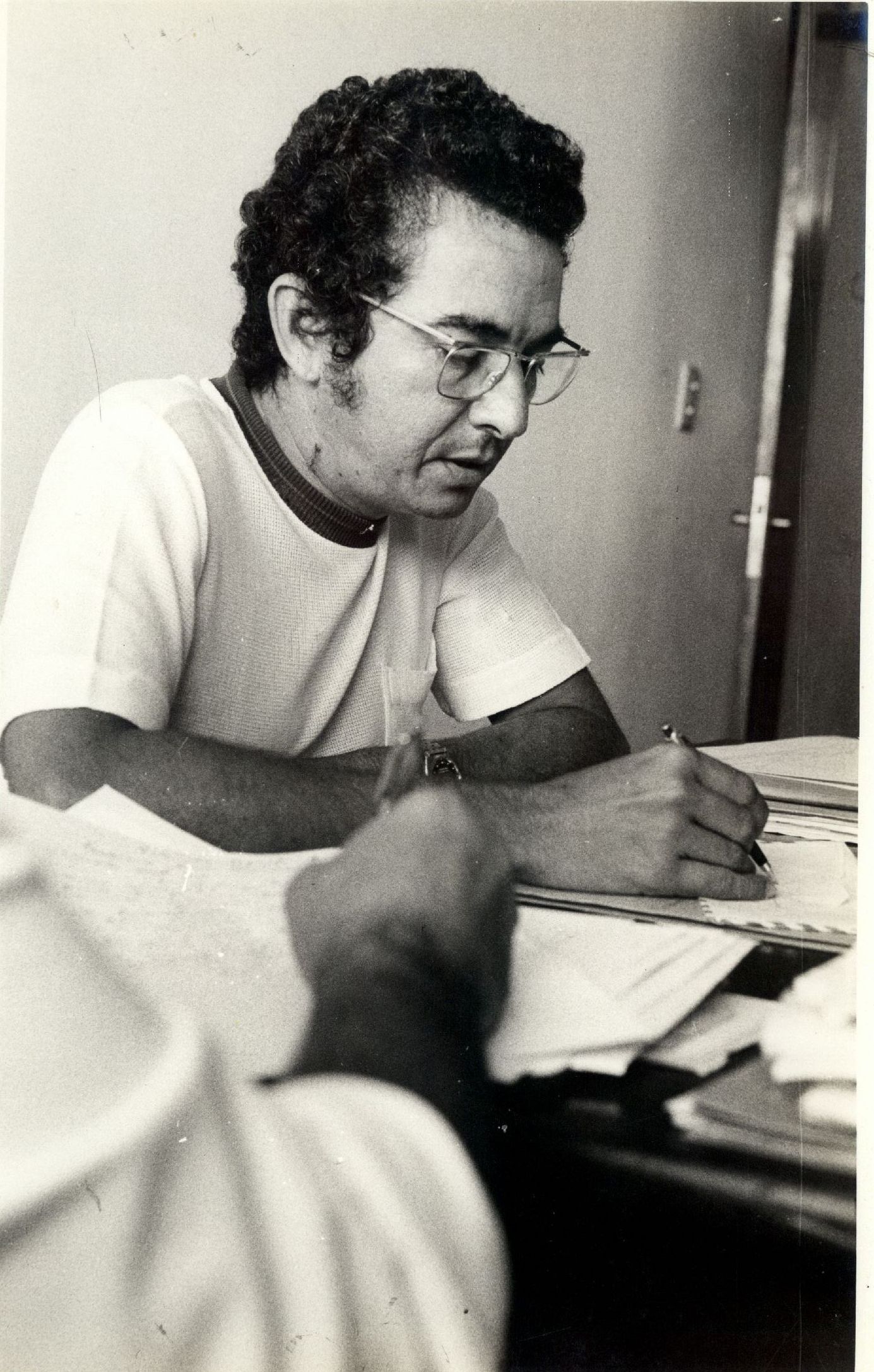 Description: Fotografia em preto e branco onde é possível visualizar homem não identificado em momento de explicação. No verso da foto consta a seguinte informação escrita à caneta: "geociencias". Há na coleção outras fotografias com conteúdo similar e encontram-se sob a indicação de localização (CTG 2D, foto 985). O pesquisador que tiver interesse nestas fotografias deve entrar em contato com o Memorial Denis Bernardes através do e-mail: mdb@ufpe.br