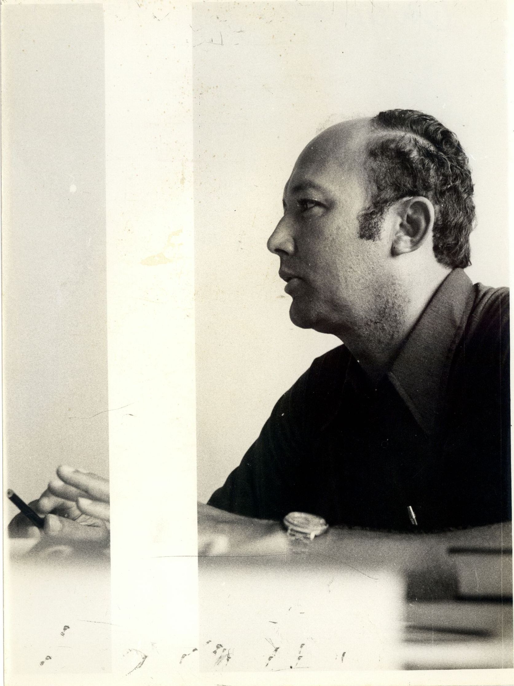 | Description: | Fotografia em preto e branco onde é possível visualizar homem não identificado em momento de fala. No verso da foto consta a seguinte informação escrita à caneta: "geociencias". |