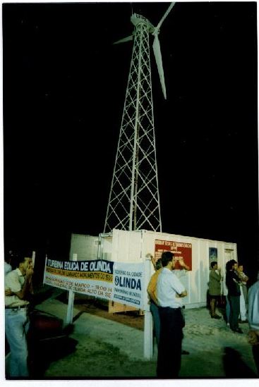 Description: Fotografia em cores onde é possível visualizar turbina de energia eólica e uma faixa com os dizeres: Turbina Eólica de Olinda. Há na coleção outras fotografias com conteúdo similar e encontram-se sob a indicação de localização (CTG 6A, fotos:70; 71). O pesquisador que tiver interesse nestas fotografias deve entrar em contato com o Memorial Denis Bernardes através do e-mail: mdb@ufpe.br