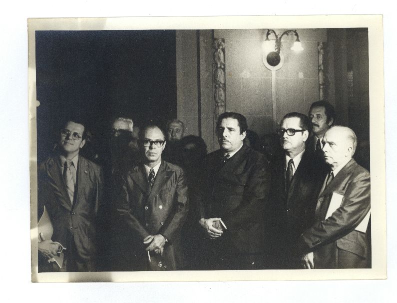 Description: Fotografia em cores onde é possivel visualizar personalidades não identificadas em pose para foto. No verso da foto consta a seguinte informação escrita à caneta: "FD".