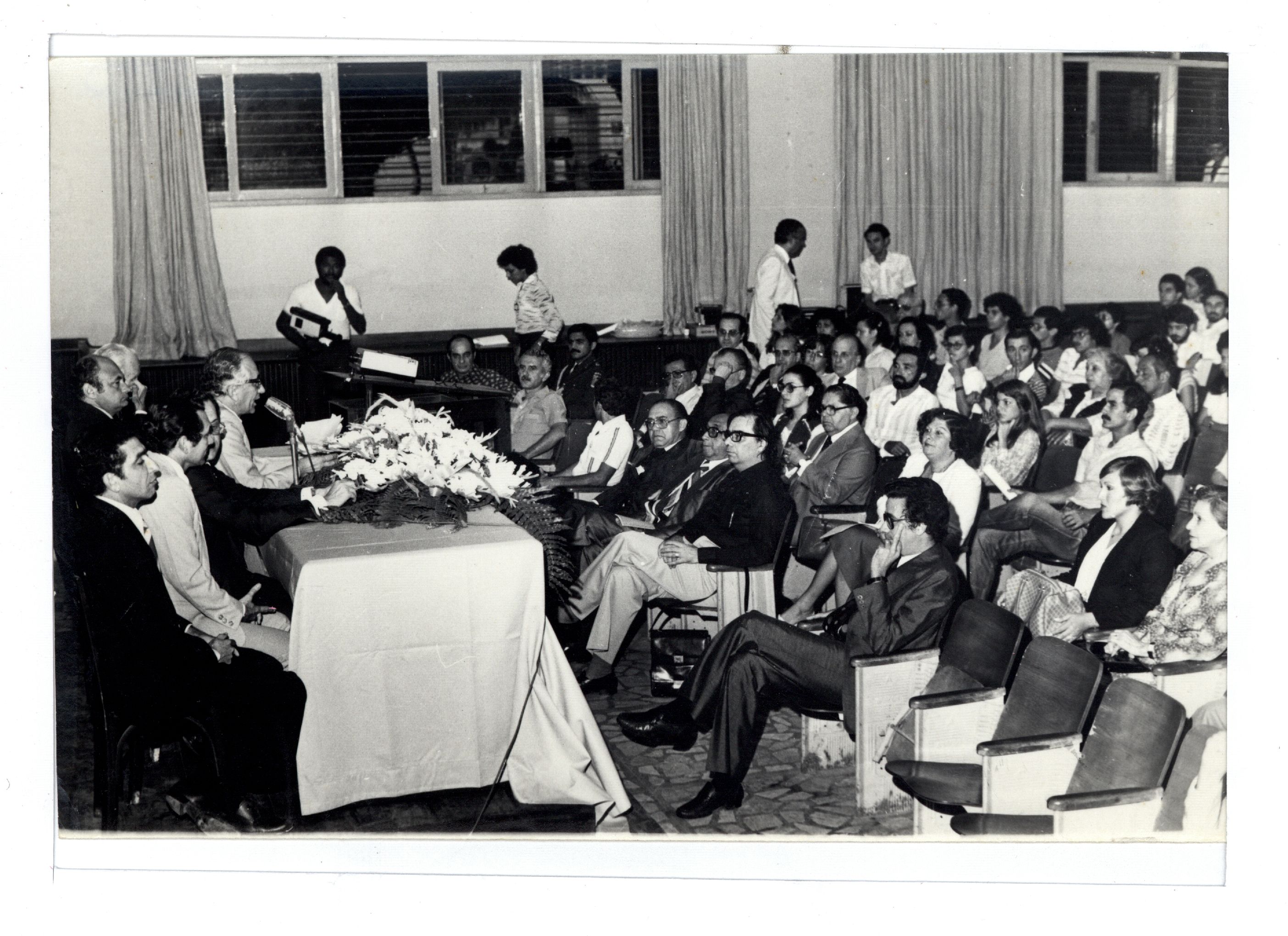 Description: Fotografia em preto e branco onde é possível visualizar homem não identificado e mesa diretiva em momento de fala no evento não identificado. Há na coleção outras fotografias com conteúdo similar e encontram-se sob a indicação de localização (Caixa 1LL, fotografias: 3281; 3282;3283; 3284). O pesquisador que tiver interesse nestas fotografias deve entrar em contato com o Memorial Denis Bernardes através do e-mail: mdb@ufpe.br.