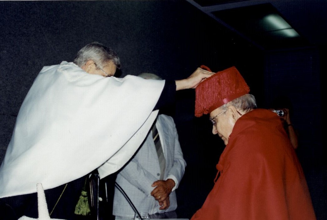 Description: Fotografia em cores de solenidade de concessão de títulos honoríficos à Newton Sucupira. Possui etiqueta adesiva no verso com a seguinte inscrição: "Assessoria de com. social-UFPE, Nome: Nenwton Sucupira, Evento/Pessoa: Prof. Emérito/Gabinete, Set/03"