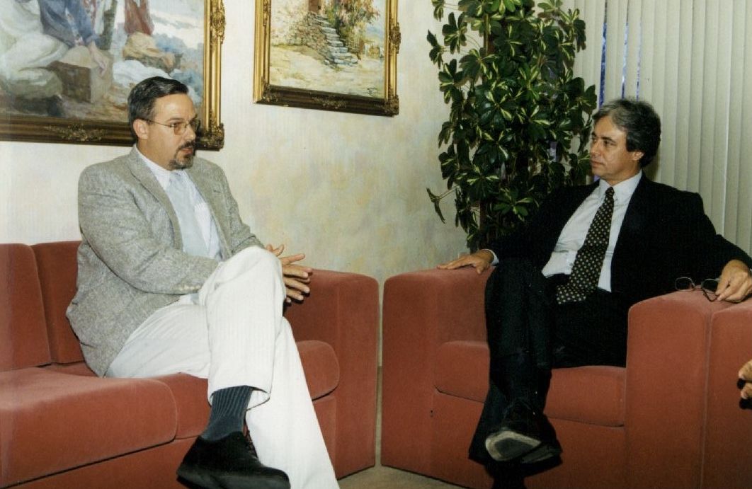Descripción : Fotografia em cores da visita do Cônsul dos Estados Unidos com a participação do Reitor Mozart Borba (à direita). Possui etiqueta adesiva no verso com a seguinte inscrição: “Reitor recebe cônsul E.U.A., Aquiles Lins Nov. 2002.”