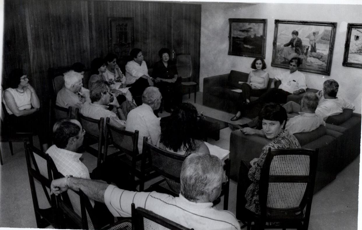 | Description: | Fotografia em preto e branco (ângulo do alto para baixo) do Reitor Mozart Ramos com 15 (quinze) pessoas, homens e mulheres, todos sentados, em evento administrativo na reitoria da Universidade Federal de Pernambuco. Título da fotografia: Evento administrativo |