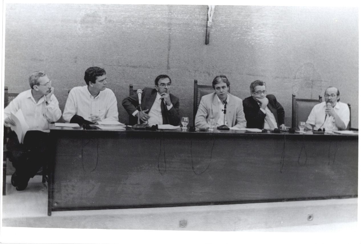 | Description: | Seis homens sentados numa mesa olhando para o lado direito, enquanto o primeiro homem da ponta direita fala segurando um microfone. |
