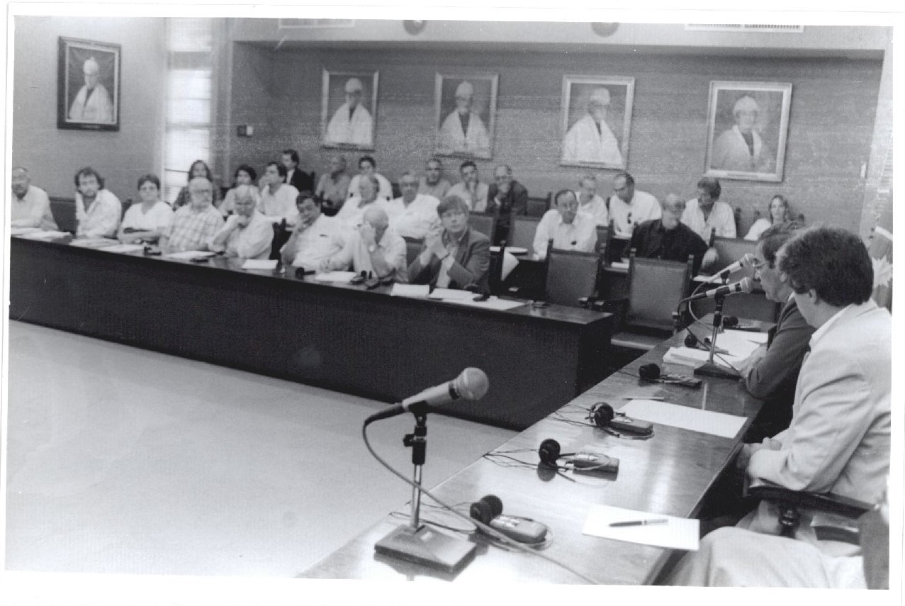 | Description: | Várias pessoas sentadas, lado a lado, numa mesa comprida. Três fileiras de mesas, uma atrás da outra, com pessoas sentadas. Na ponta direita da foto, um grupo de homens sentados, lado a lado, numa mesa com papéis, copos e microfones espalhados, os mesmos falam para as pessoas que estão nas outras três mesas, enquanto essas pessoas observam. No verso da fotografia há a seguinte informação escrita à caneta "Universidades européias p/ avaliação da UFPE". |
