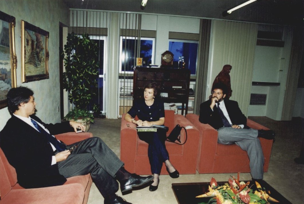 | Descripción : | Três pessoas, uma mulher e dois homens, sentadas em poltronas, em frente a uma mesa de centro com flores, conversando entre si. Atrás da fotografia tem escrito: Gabinete do Reitor. |