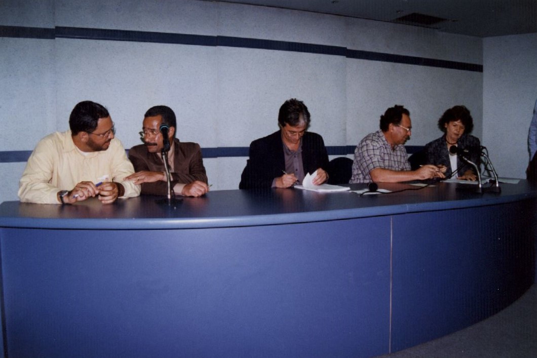 Descripción : Cinco pessoas sentadas em frente à uma mesa com microfones em cada extremidade. O homem que está sentado no centro escreve em alguns papéis, enquanto as pessoas nos dois lados conversam entre si.