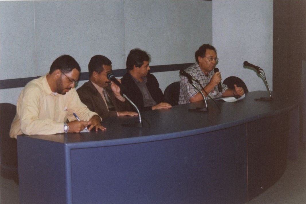 | Descripción : | Quatro homens sentados em frente à uma mesa com microfones em cada extremidade. O primeiro homem, da esquerda para direita, escreve algo num papel. Enquanto os dois homens ao seu lado direito olham para o homem na ponta que fala ao microfone. |