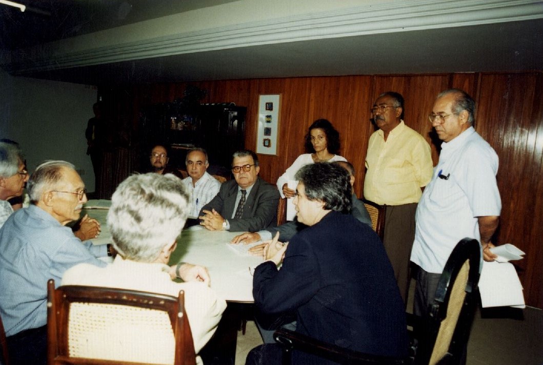 Descripción : Um grupo de pessoas sentadas e em pé ao redor de uma mesa branca. Todos estão observando um homem de paletó que está de costas para a fotografia, sentado na ponta da mesa gesticulando para os demais.