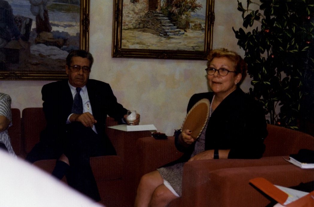 Descripción : Fotografia onde se encontram três pessoas, duas visíveis e uma oculta. Vemos duas pessoas, um homem, vestido com terno e gravata, de semblante sério, e uma mulher, trajando um vestido e casaco, em uma de suas mãos se encontra um leque, possui semblante calmo e risonho.