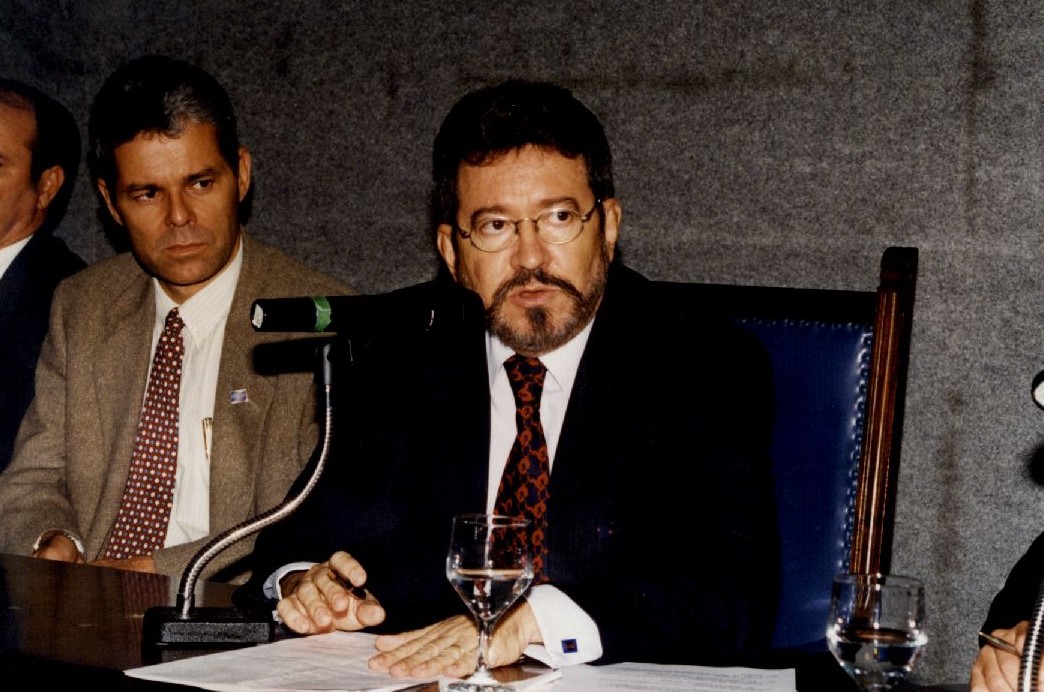 Description: Registro fotográfico de quatro homens sentados em frente de uma mesa. Os dois homens dos cantos direito e esquerdo estão parcialmente cortados da fotografia. Ao centro existe um homem, vestido formalmente de terno e gravata, que olha firmemente para frente enquanto fala, ao seu lado está um homem que o observa atentamente.