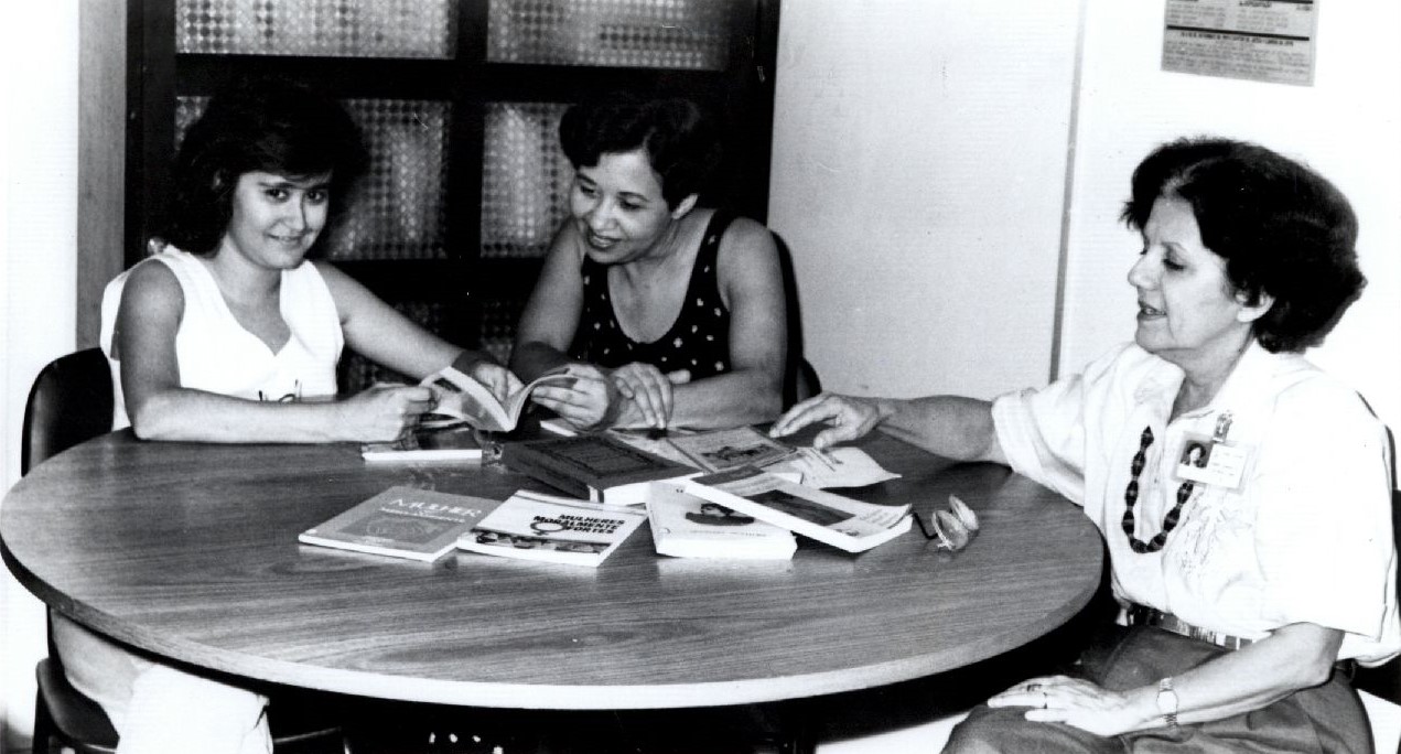 Description: Fotografia em preto e branco de três mulheres reunidas ao redor de uma mesa cheia de livros. Duas delas folheiam um dos volumes. É possível ler que ao menos dois dos títulos referem-se a mulheres. "04-10; Larg - 18.8" escrito no verso, à caneta.